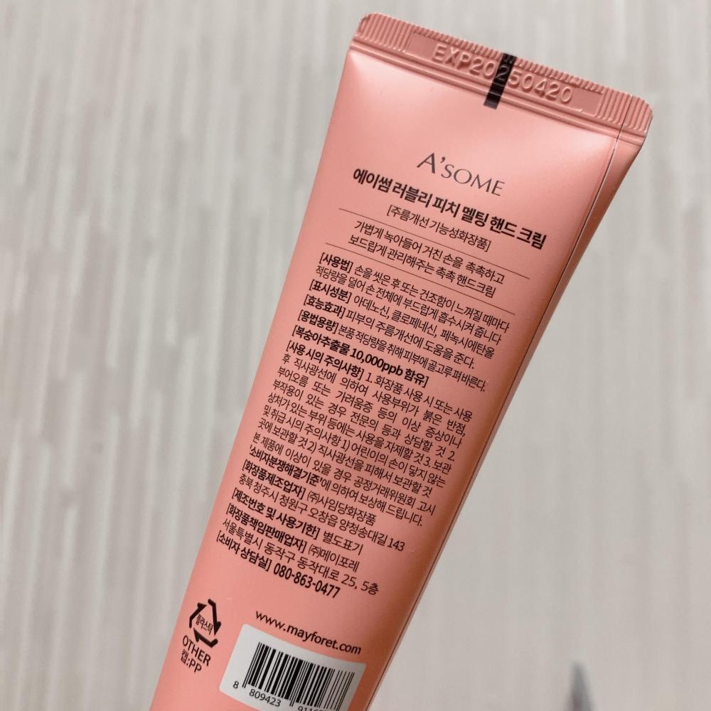 복숭아 향이 가득한 에이썸 피치 핸드크립입니다 제형은 꾸덕한 제형인데 바르면 흡수도 잘되고 끈적임이 없어요 일단 저는 피치향이 너무 마음에 들었어요 향에 민감한데, 인공적인 향 느낌이 아니라서 좋았어요 식품의약품안전처 주름개선 기능성 원료로 등록되어있는 '아데노신'이라는 성분이 들어가 있어 주름개선 기능성도 있다고 합니다!